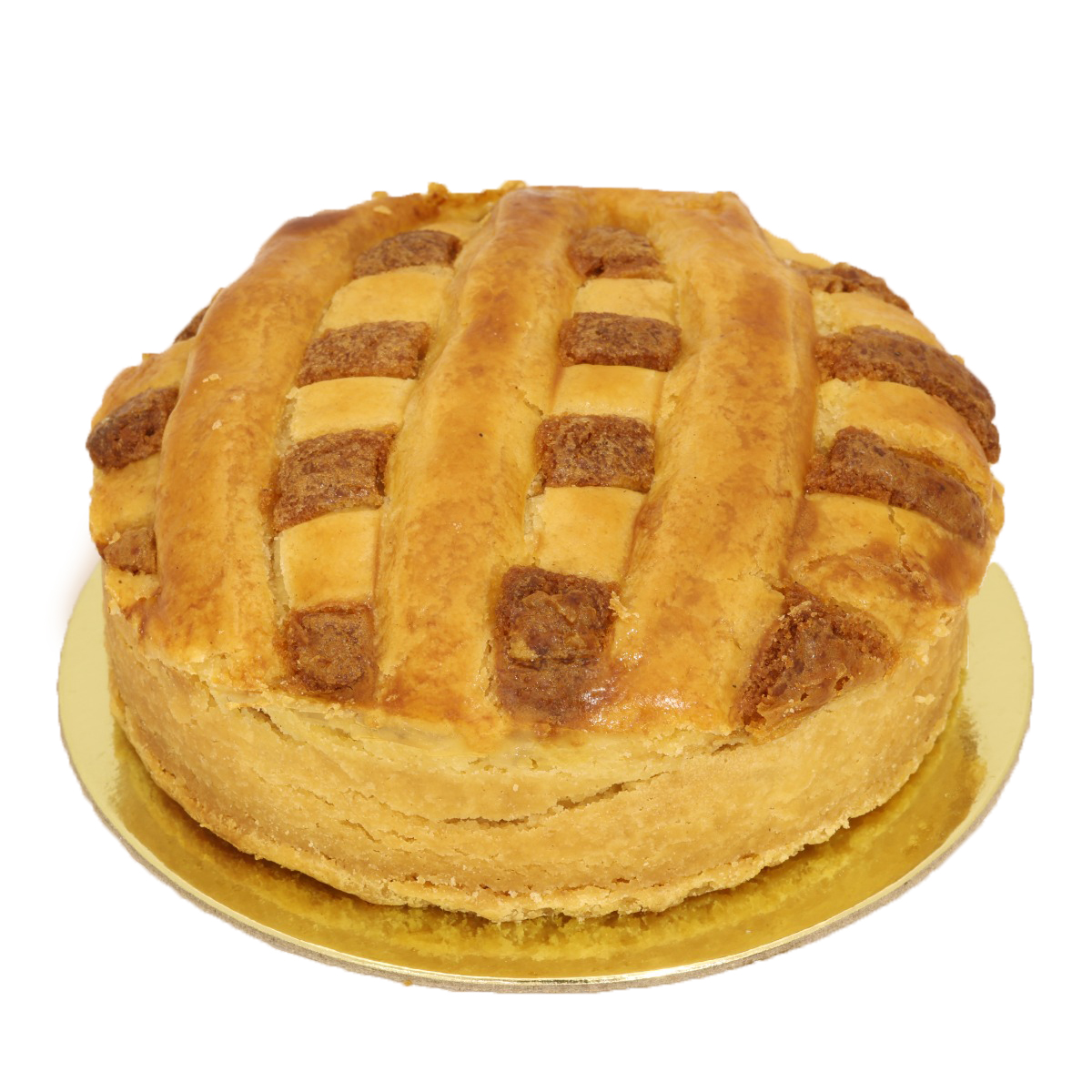 Crispy crust filled with a creamy mixture of ground almonds, apricot jam and dried raisins.