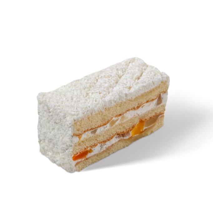 A tender vanilla sponge filled with a refreshing fruit salad, where creamy sweetness meets bursts of bright, juicy freshness, evoking a snowy forest enlivened by vibrant, sun-kissed notes in every indulgent bite.